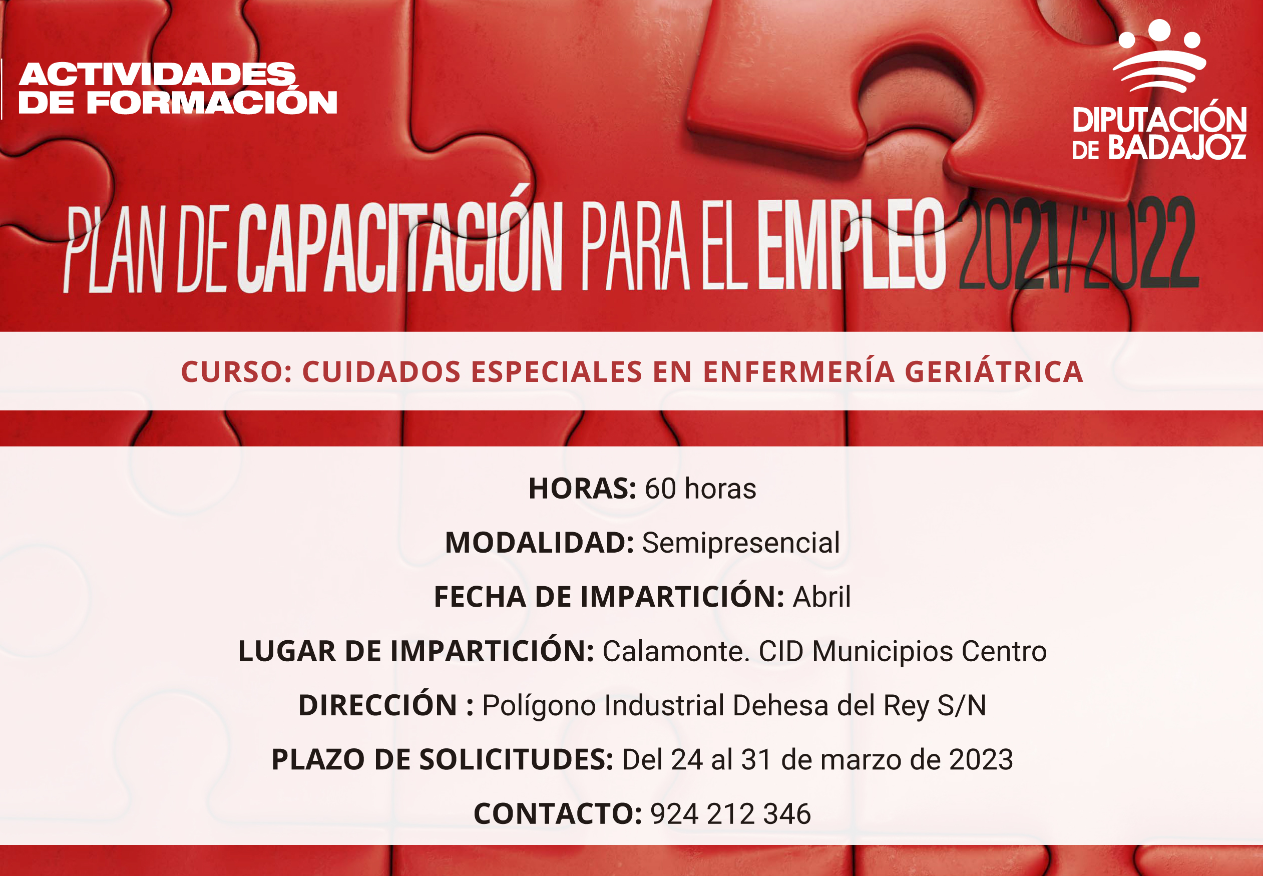 La Diputación de Badajoz, a través del Plan de Capacitación para el Empleo 2021-2022, desarrollado por el Servicio de Capacitación para el Empleo, dependiente del Área de Desarrollo Rural y Sostenibilidad de la Diputación de Badajoz, abre el plazo de solicitudes para participar en la acción formativa gratuita en ‘‘Cuidados especiales en enfermería geriátrica’’, para dar comienzo el próximo mes de abril en el CID Municipios Centro de Calamonte.
