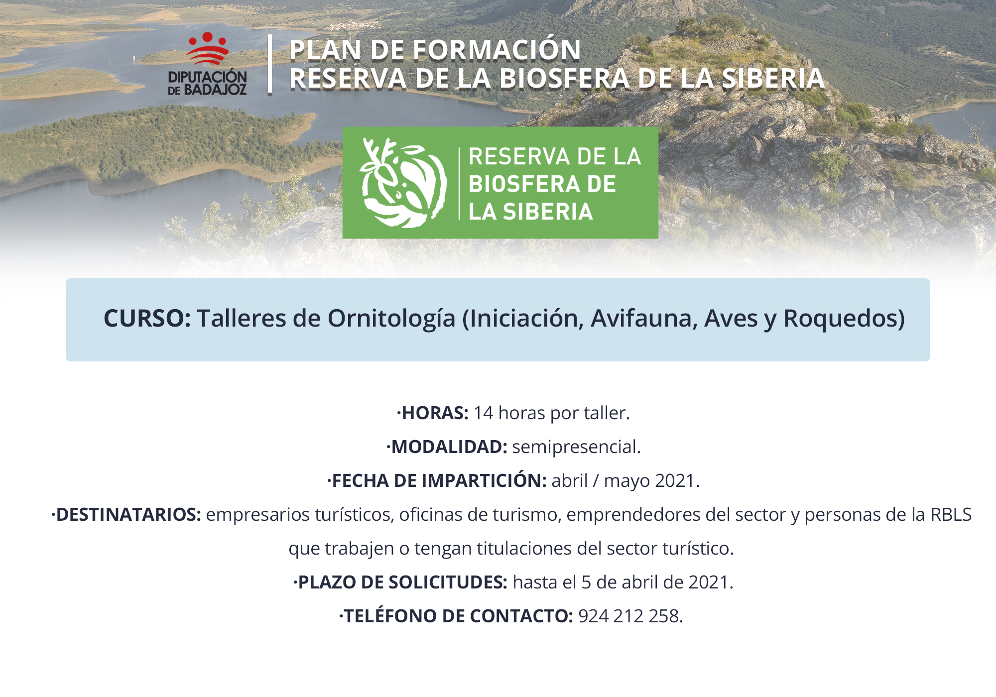 Desde el Plan de Capacitación para el Empleo Reserva de la Biosfera de La Siberia, un proyecto surgido de la colaboración entre el CEDER La Siberia, el personal técnico de la Reserva de la Biosfera y el equipo del Servicio de Capacitación para el Empleo del Área de Desarrollo Rural y Sostenibilidad; se van a iniciar tres talleres de ornitología: “Ornitoinicia: iniciación a la ornitología”, “Ornitoavif: avifauna por hábitat y sus características ecológicas en la RBLS”, y “Ornitoroq: aves forestales y roquedos”.