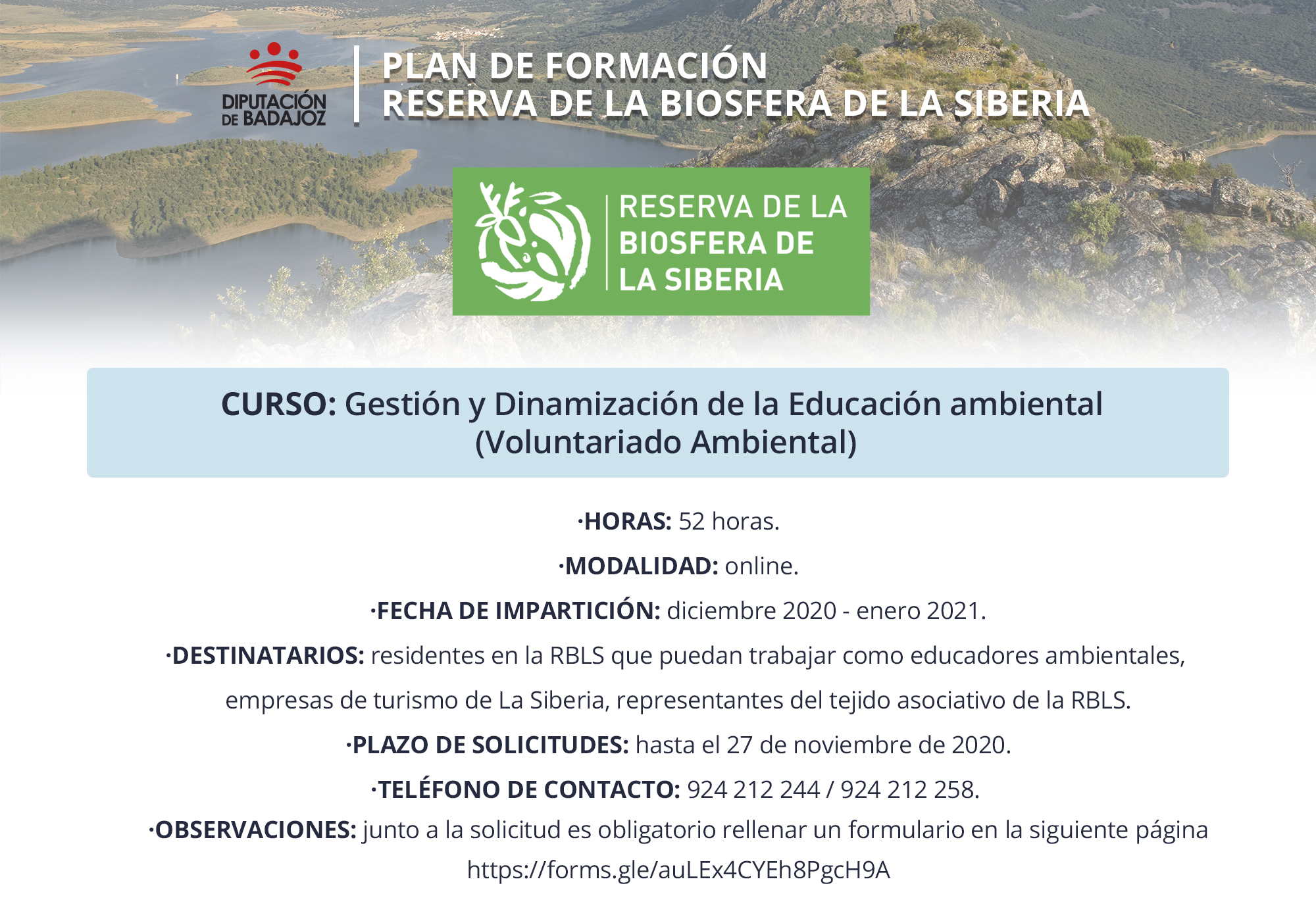 Desde el Plan de Capacitación para el Empleo Reserva de la Biosfera de La Siberia, un proyecto surgido de la colaboración entre el CEDER La Siberia, el personal técnico de la Reserva de la Biosfera y el equipo del Servicio de Capacitación para el Empleo del Área de Desarrollo Rural y Sostenibilidad; se va a iniciar un curso de Gestión y Dinamización de la Educación ambiental (Voluntariado Ambiental).
