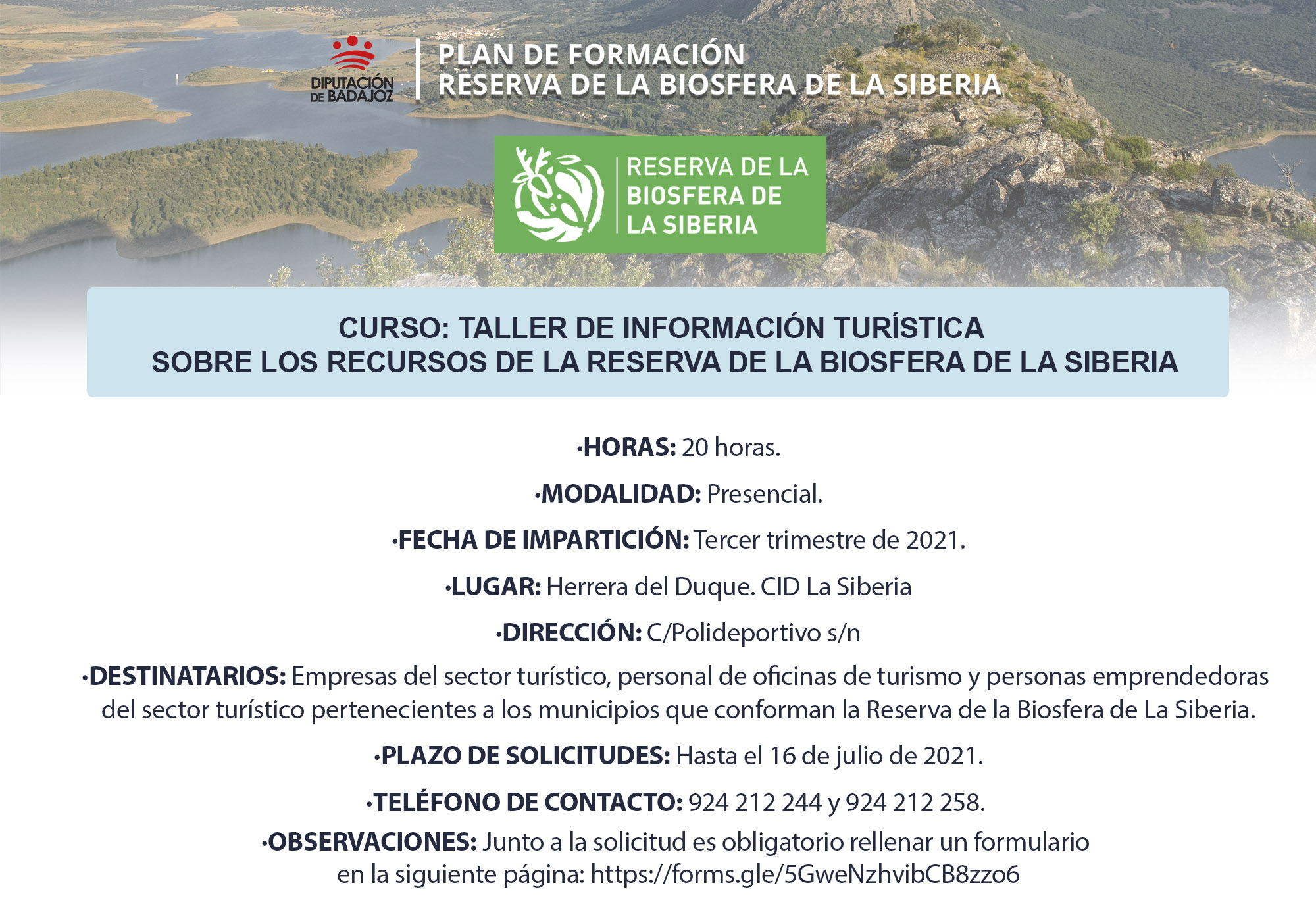 Desde el Plan de Capacitación para el Empleo Reserva de la Biosfera de La Siberia, un proyecto surgido de la colaboración entre el CEDER La Siberia, el personal técnico de la Reserva de la Biosfera y el equipo del Servicio de Capacitación para el Empleo del Área de Desarrollo Rural y Sostenibilidad, se va a iniciar un Taller de información turística sobre los recursos de la Reserva de la Biosfera de La Siberia en Herrera del Duque.
