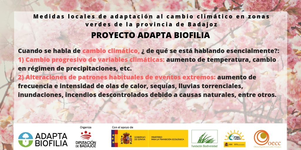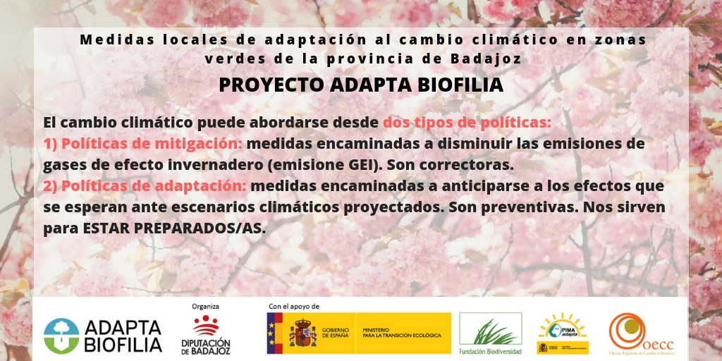 El proyecto ADAPTA BIOFILIA ofrece soluciones que se encuadran dentro de las conocidas como medidas verdes que son las que utilizan los múltiples servicios y funciones de los ecosistemas y la naturaleza para ayudar a la sociedad a hacer frente al cambio climático. Su objetivo es mantener y aumentar la resiliencia y reducir la vulnerabilidad de los ecosistemas y los seres humanos frente a los efectos  adversos del cambio climático. Las acciones de adaptación verdes tienen un beneficio doble. Aumentan la capacidad adaptativa de un municipio por un lado pero también tienen un efecto mitigador al actuar las plantas como sumidero de carbono, es decir, como depuradoras del aire mejorando su calidad.