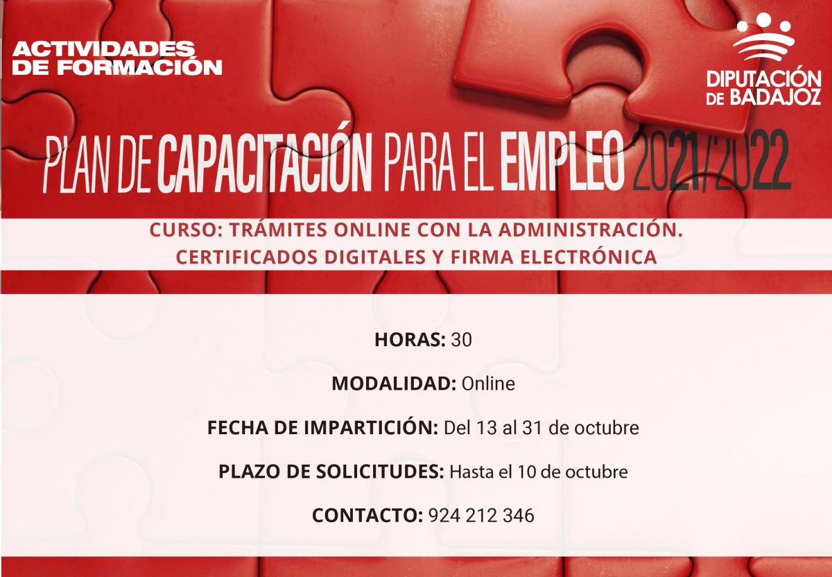 La Diputación de Badajoz, a través del Plan de Capacitación para el Empleo 2021-2022, desarrollado por el Servicio de Capacitación para el Empleo, dependiente del Área de Desarrollo Rural y Sostenibilidad, va a iniciar la tercera edición de la acción formativa en ‘’Trámites online con la administración. Certificados digitales y firma electrónica’’.