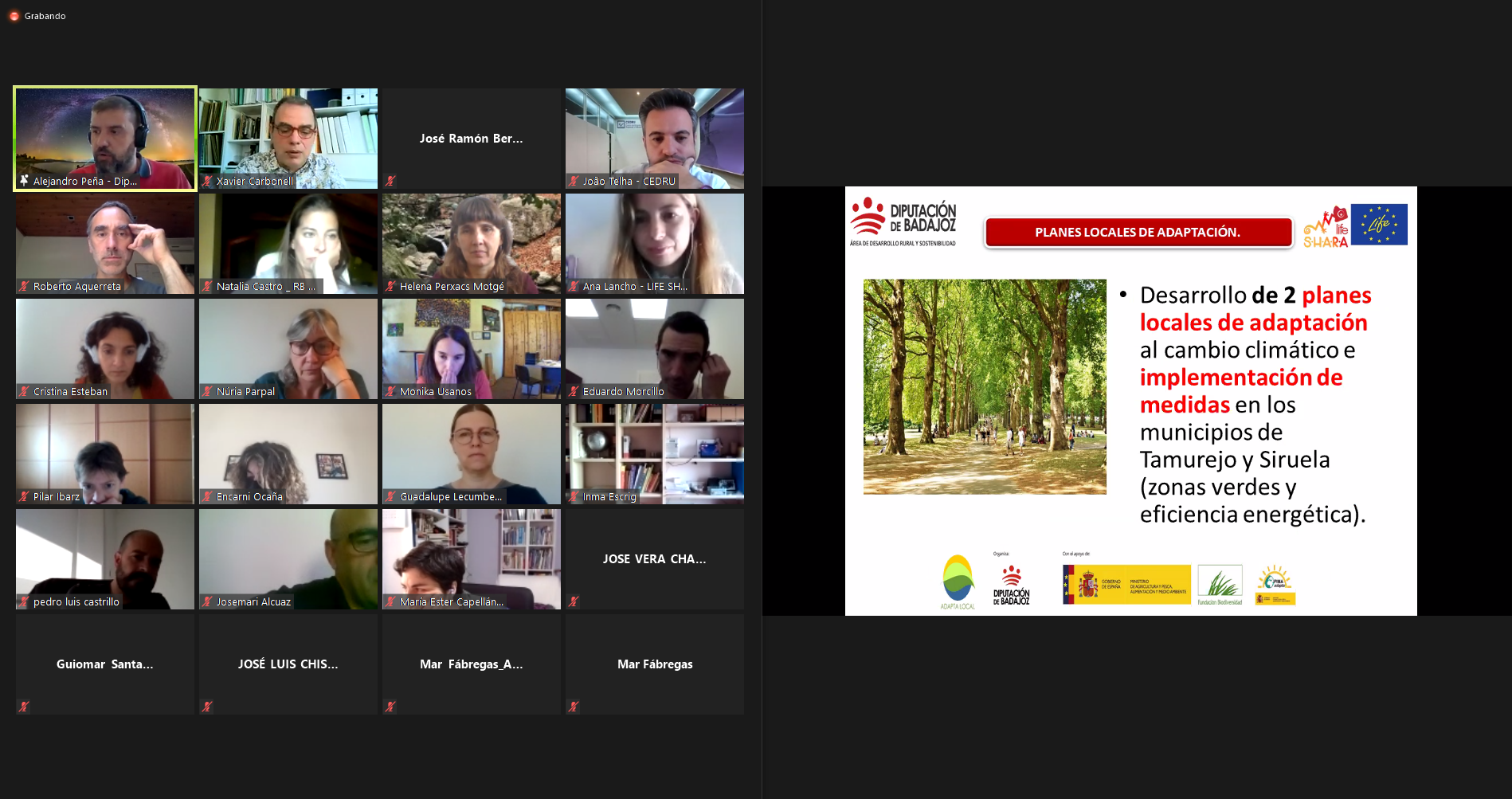 Alejandro Peña ha mostrado a los gestores locales participantes en la formación, la experiencia adquirida en el desarrollo de proyectos de adaptación local climática, como el proyecto Adapta Local, ejecutado por el Área de Desarrollo Rural y Sostenibilidad, que contaba con el apoyo de la Fundación Biodiversidad del Ministerio para la Transición Ecológica y Reto Demográfico, y que consistía en el desarrollo de actuaciones de adaptación al cambio climático en zonas verdes rurales de los municipios de Siruela y Tamurejo.