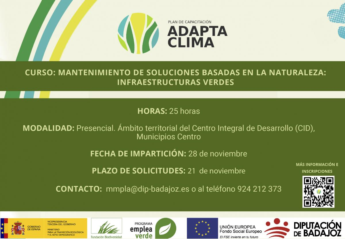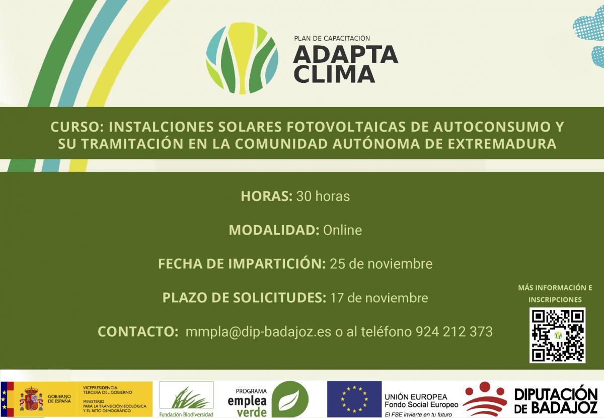 La Diputación de Badajoz, a través del proyecto Adapta Clima, desarrollado por el Servicio de ODS, Alianzas y Proyectos del Área de Desarrollo Rural y Sostenibilidad de la Diputación de Badajoz, va a iniciar diferentes acciones formativas durante el mes de noviembre y diciembre con variados temas (energías renovables, movilidad sostenible e infraestructura verde), todos relacionados con el empleo que genera la adaptación y mitigación del cambio climático.