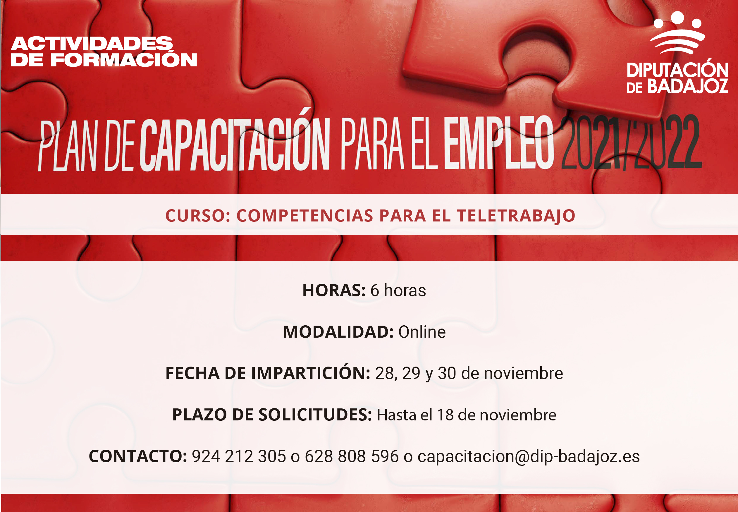 La Diputación de Badajoz, a través del Plan de Capacitación para el Empleo 2021-2022, desarrollado por el Servicio de Capacitación para el Empleo, dependiente del Área de Desarrollo Rural y Sostenibilidad, va a iniciar la acción formativa en ‘’Competencias para el teletrabajo’’.