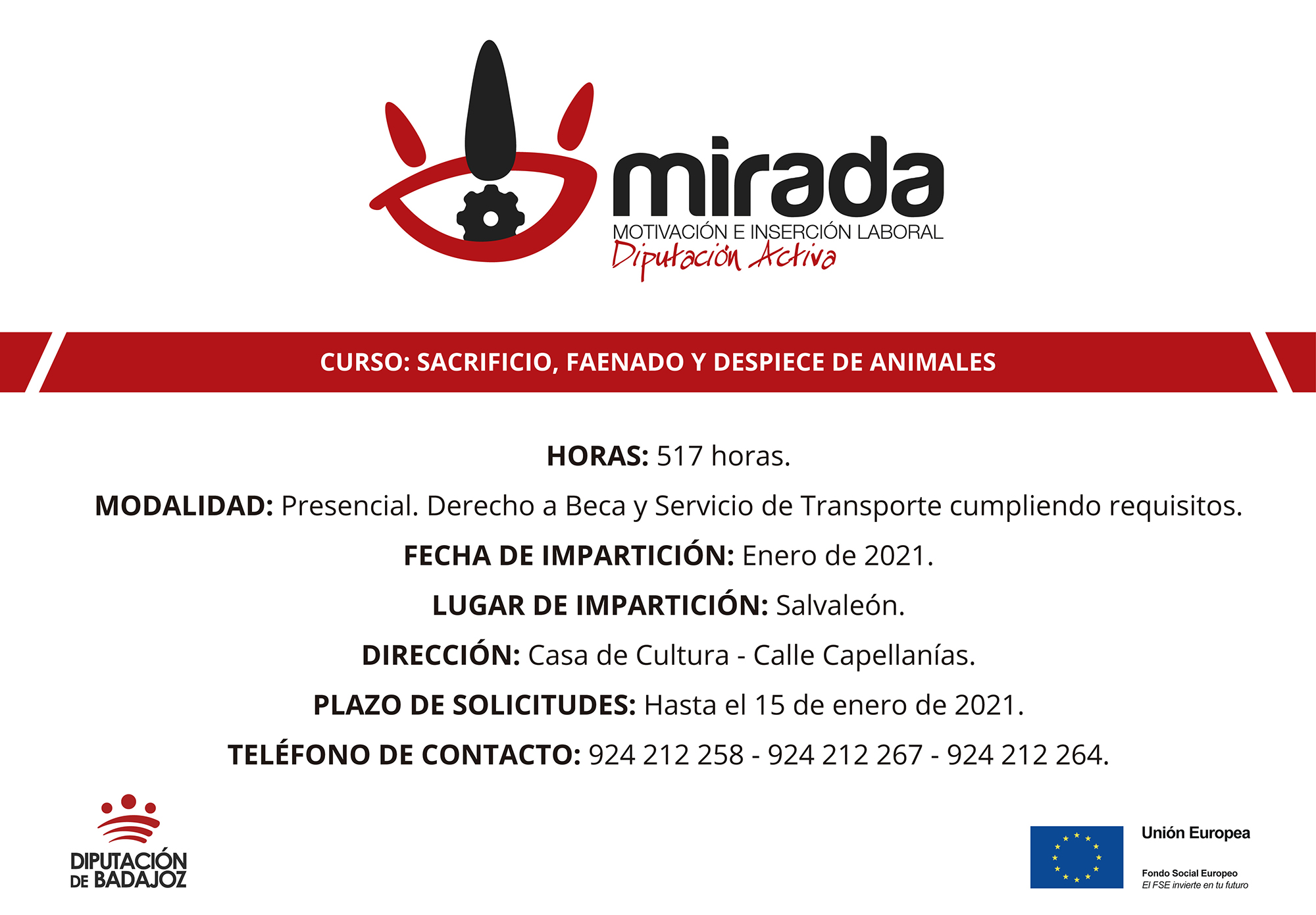 Diputación de Badajoz, a través del Proyecto MIRADA (Motivación e Inserción Laboral Diputación Activa), desarrollado por el Servicio de Capacitación para el Empleo, dependiente del Área de Desarrollo Rural y Sostenibilidad y en colaboración con la Oficina de Proyectos Europeos, va a iniciar un curso de formación de "Sacrificio, faenado y despiece de animales" en la localidad de Salvaleón.