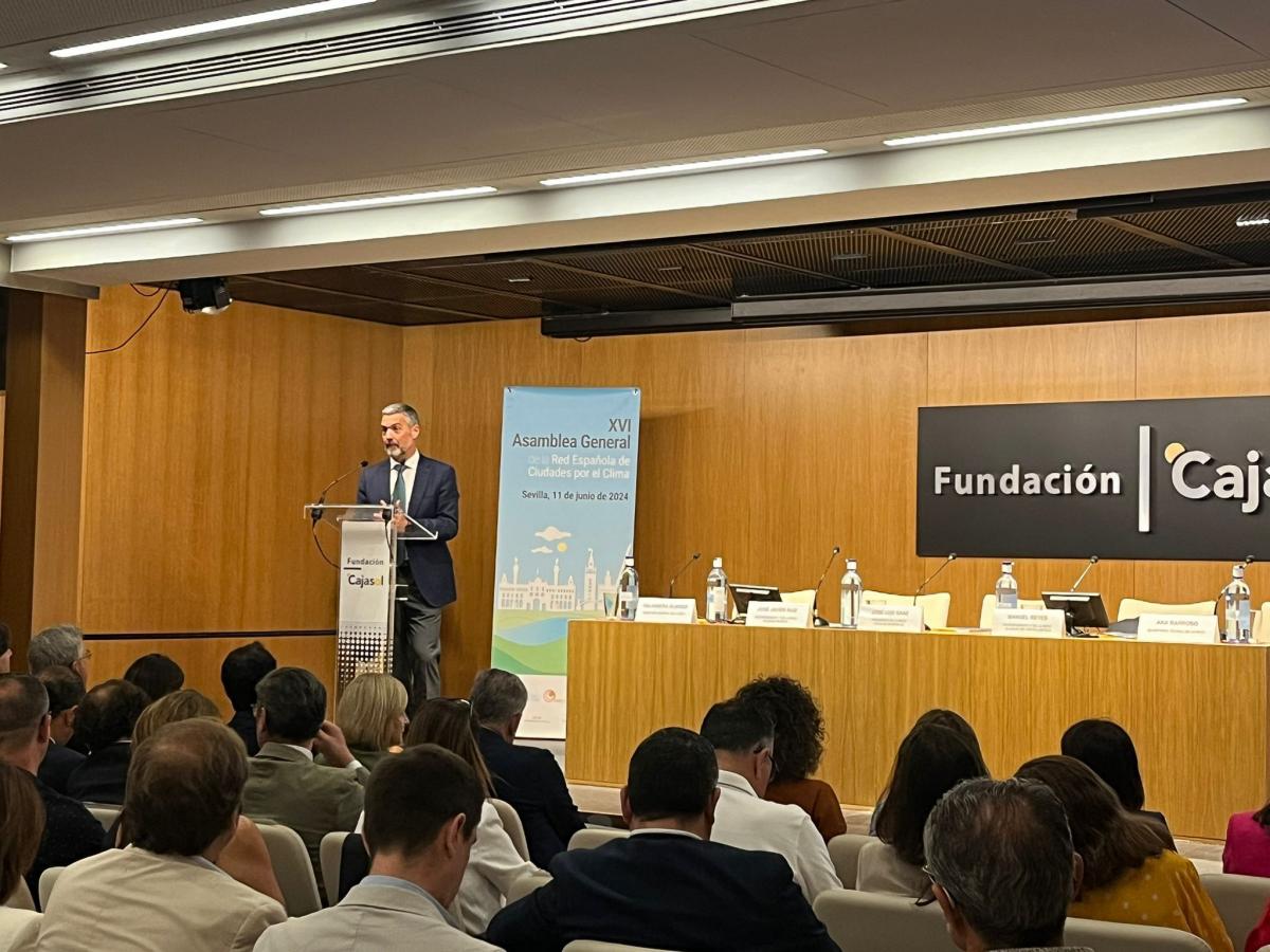 La Red Española de Ciudades por el Clima ha celebrado esta semana en el recinto de la Fundación Cajasol, de Sevilla, su XVI Asamblea General, un encuentro en el que esta Red de la FEMP, en la que se integran 368 Gobiernos Locales que llevan a sus políticas y proyectos el compromiso frente al cambio climático, ha sentado las bases constituyentes para un nuevo periodo de actividad. La Asamblea ha sido el punto principal de un acto en cuya inauguración ha estado presente en representación de la institución provincial, Raúl Jareño, diputado delegado del Área de Transición Ecológica.
