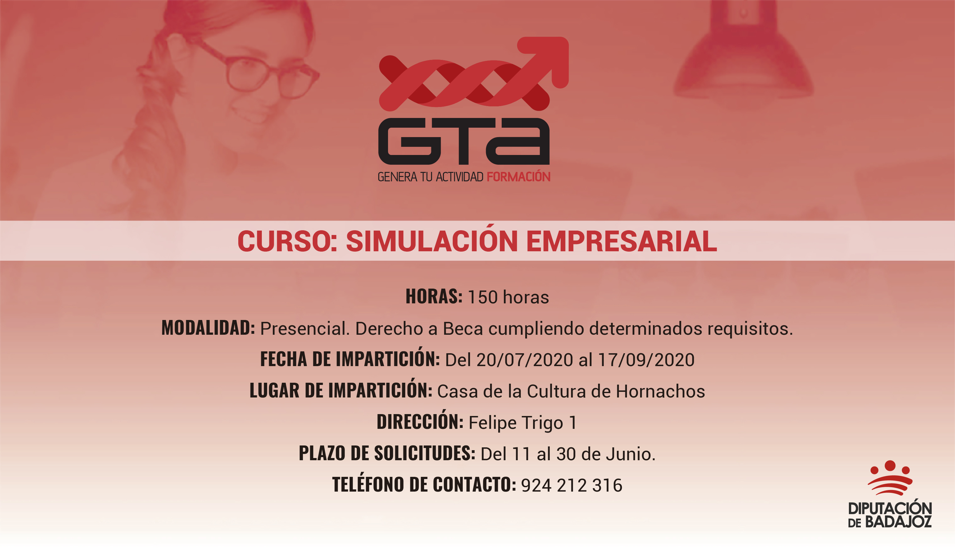 Por ello, Diputación de Badajoz, a través del Proyecto GTA Formación (Genera Tu Actividad), impulsado por el del Área de Desarrollo Rural y Sostenibilidad y la Oficina de Proyectos Europeos, va a iniciar un curso de formación de "Simulación Empresarial" en el la Casa de Cultura de la localidad de Hornachos, perteneciente al territorio CID TIERRA DE BARROS - RÍO MATACHEL.