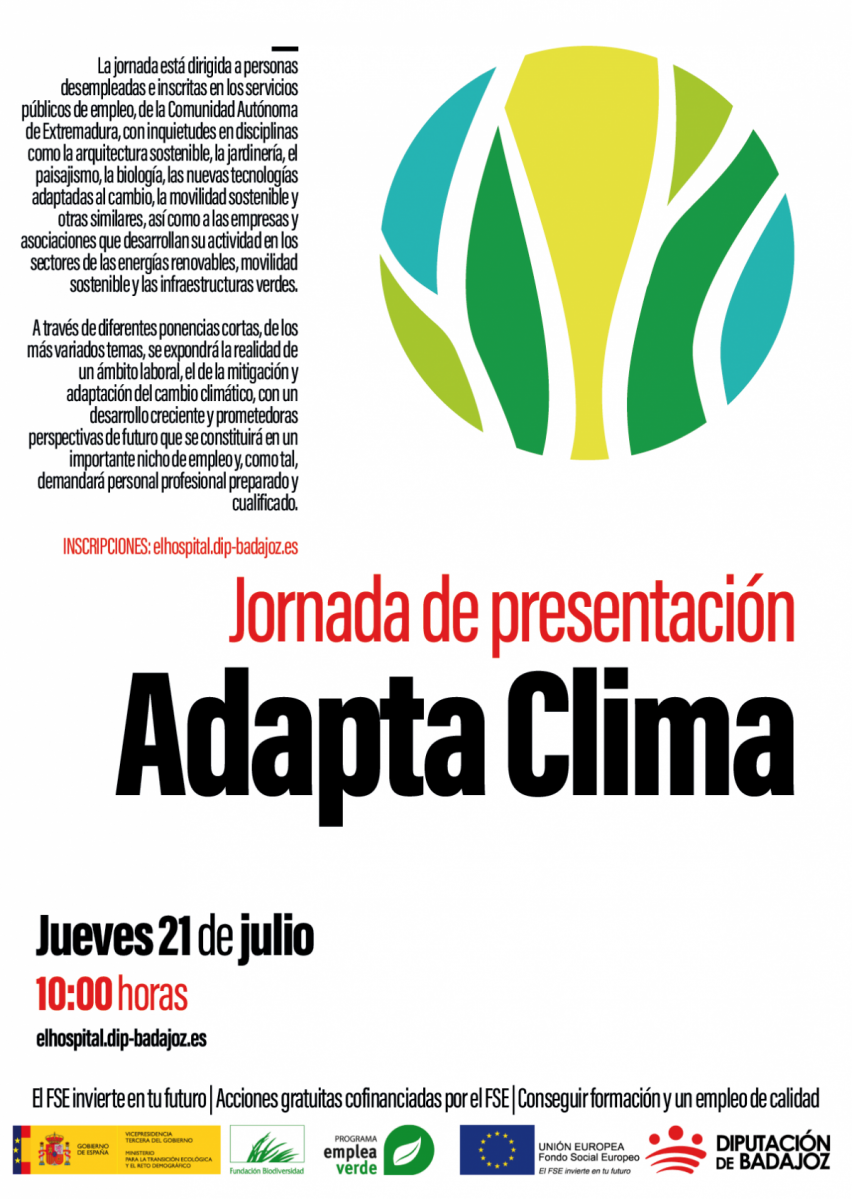 El Servicio de ODS, Alianzas y Proyectos del Área de Desarrollo Rural y Sostenibilidad de la Diputación de Badajoz va a realizar una jornada de presentación del proyecto “ADAPTA CLIMA: Oportunidades y estrategias asociadas a la adaptación y mitigación del Cambio Climático”. La jornada tendrá lugar el día 21 de Julio de 2022, en las instalaciones de El Hospital Centro Vivo.