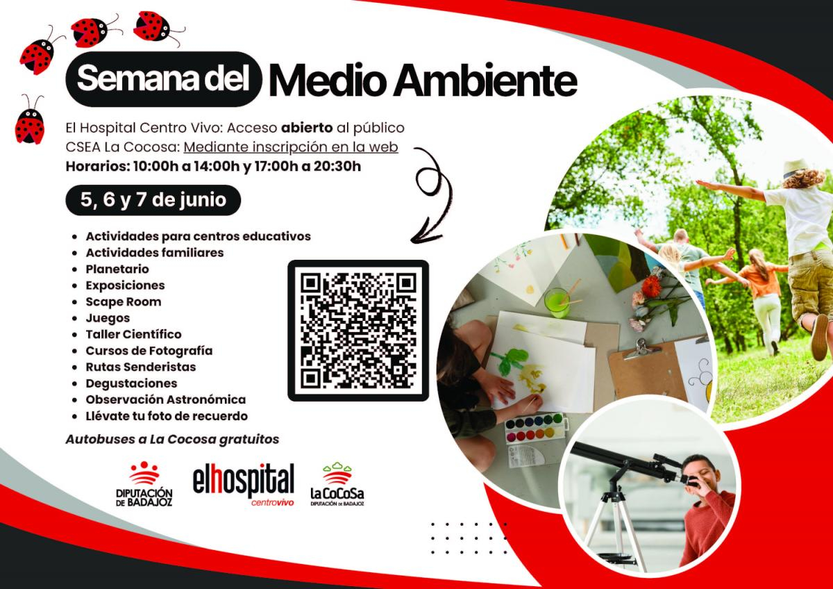 La Diputación de Badajoz, a través de su Área de Transición Ecológica, ha presentado hoy en rueda de prensa la programación de la Semana del Medio Ambiente, que se celebrará entre el 2 y el 7 de junio. El programa incluye una amplia variedad de actividades gratuitas diseñadas para todos los públicos, con propuestas en dos sedes principales: el Hospital Centro Vivo (Badajoz) y la Finca La Cocosa.