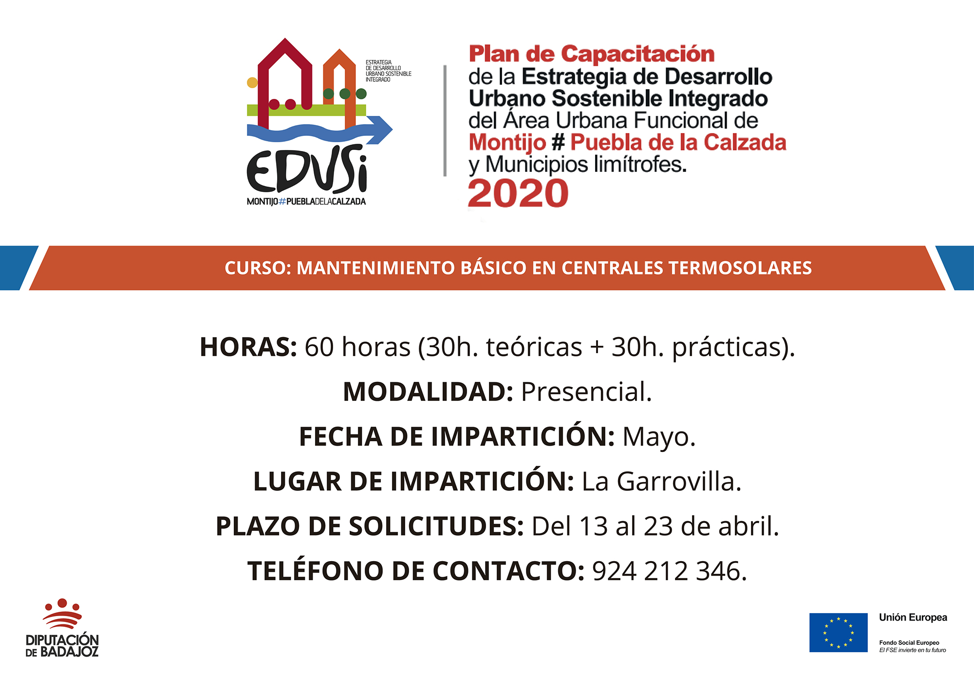 Diputación de Badajoz, a través del Plan de Capacitación para el Empleo y contra la exclusión social de la Estrategia de Desarrollo Urbano Sostenible Integrado (EDUSI), coordinado por el Servicio de Capacitación para el Empleo, dependiente del Área de Desarrollo Rural y Sostenibilidad, va a iniciar una acción formativa de Mantenimiento básico en centrales termosolares, en la localidad de La Garrovilla.