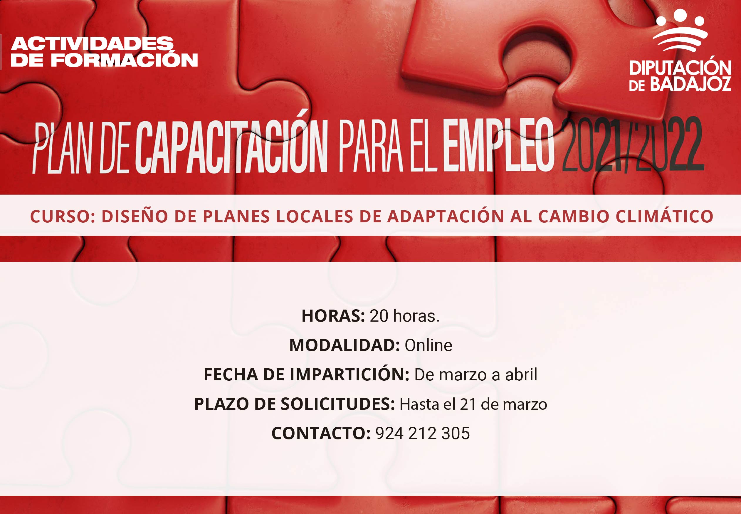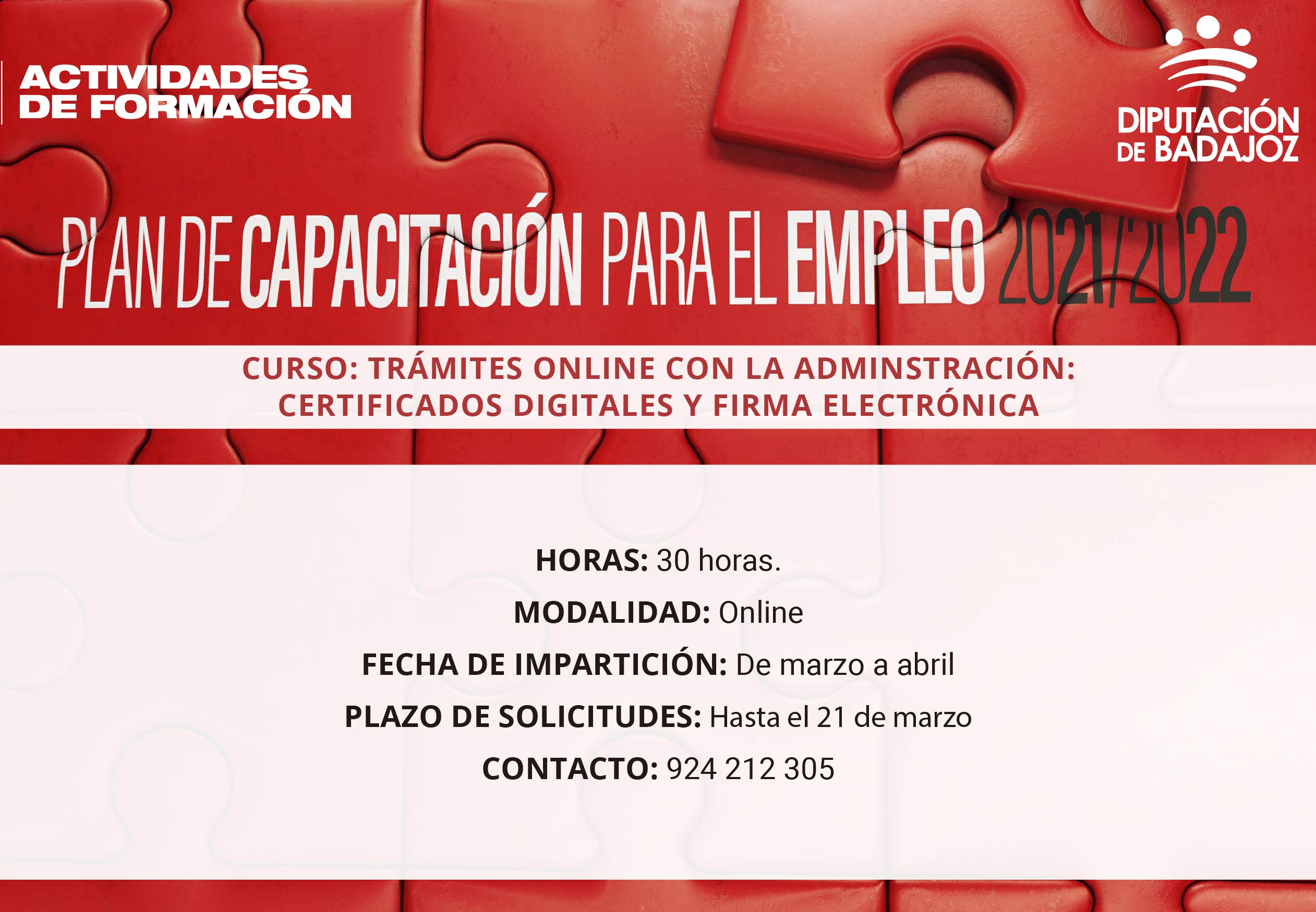 La Diputación de Badajoz, a través del Plan de Capacitación para el Empleo 21-22, desarrollado por el Servicio de Capacitación para el Empleo, dependiente del Área de Desarrollo Rural y Sostenibilidad, va a iniciar dos acciones formativas, un curso de ‘’Trámites online con la administración. Certificados digitales y firma electrónica’’, y un curso de ‘’Diseño de planes de adaptación al cambio climático’’.