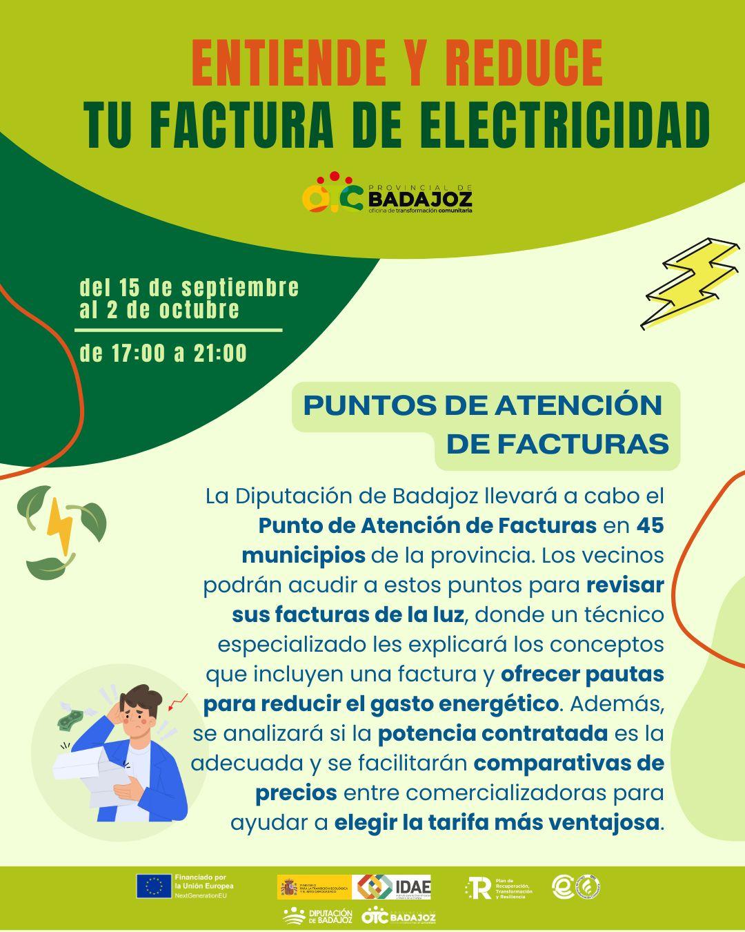 La Oficina de Transformación Comunitaria (OTC) Provincial de Badajoz, impulsada por el Área de Transición Ecológica de la Diputación de Badajoz, extiende sus servicios con el lanzamiento de un Punto Itinerante de Atención a la Factura en 45 municipios de la provincia. Este servicio constituye una herramienta más para ayudar a los ciudadanos a ahorrar, junto con los talleres de eficiencia energética y la participación en comunidades energéticas