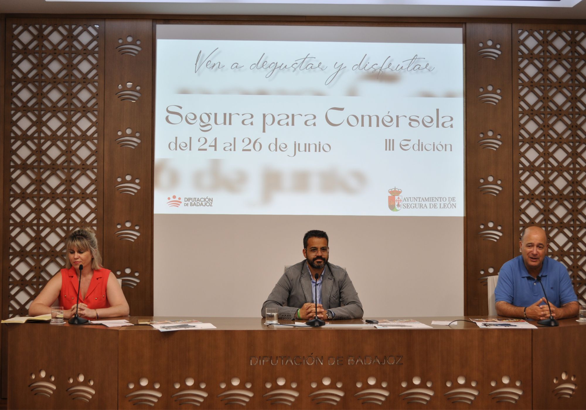 El próximo fin de semana, concretamente del 24 al 26 de junio, Segura de León celebrará la tercera edición de su feria gastronómica ‘Segura para comérsela’. El evento ha sido presentado por el diputado delegado del Área de Transformación Digital y Turismo de la Diputación de Badajoz, Manuel José González Andrade, acompañado por el diputado delegado del Área de Desarrollo Rural y Sostenibilidad de la institución provincial y alcalde de Segura de León, Lorenzo Molina Medina, y por la concejala de Festejos del Ayuntamiento segureño, Isabel Garduño.