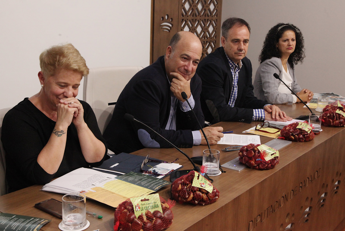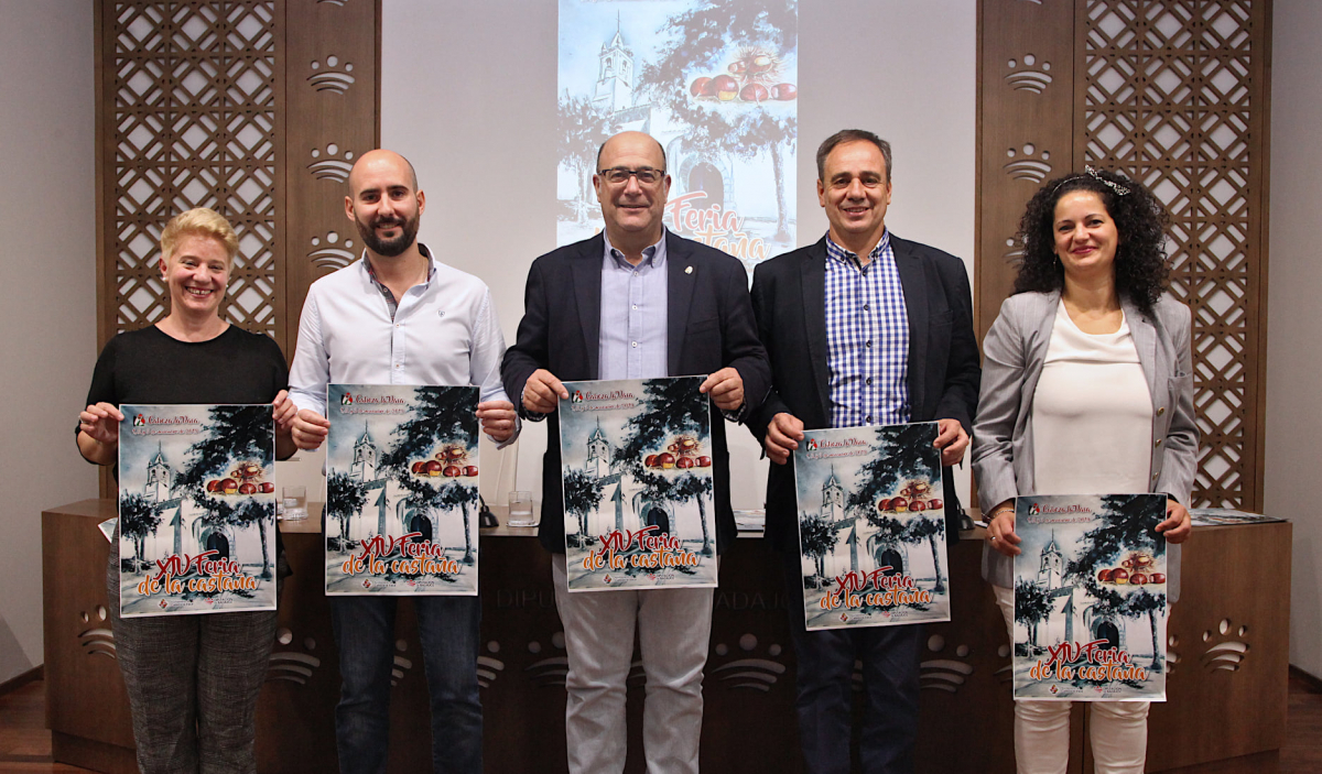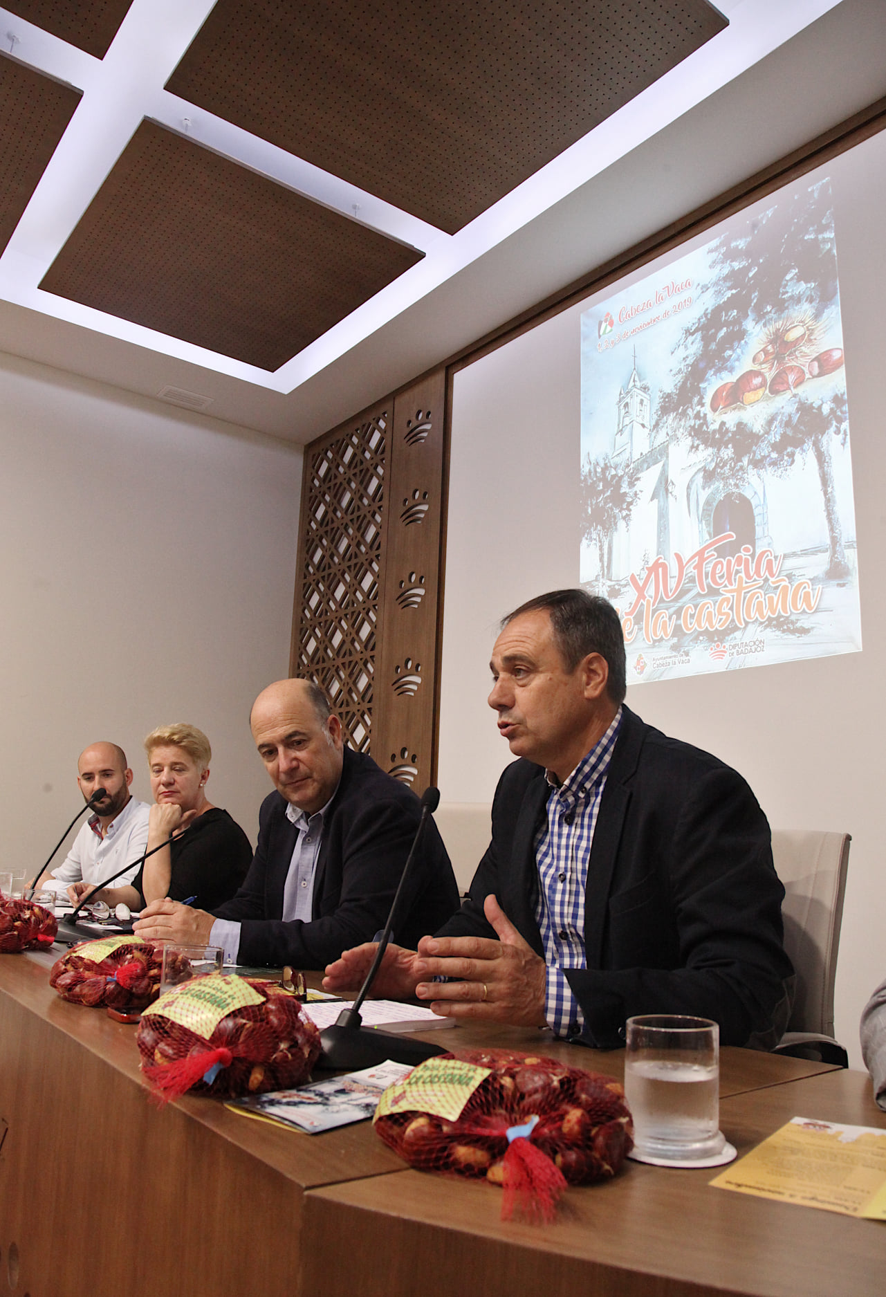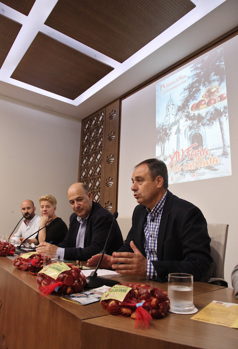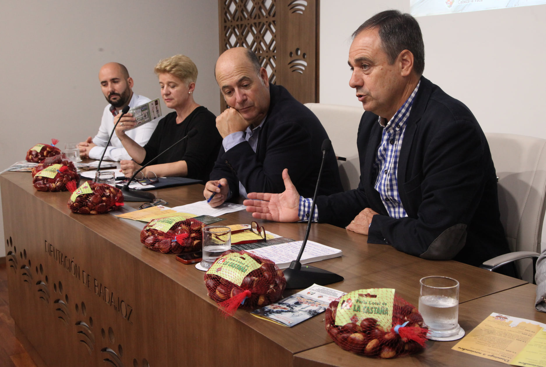 Esta mañana, en la sala de prensa de la Diputación provincial de Badajoz, el diputado delegado del Área de Desarrollo Rural y Sostenibilidad, Lorenzo Molina Medina, junto con el alcalde de Cabeza la Vaca, Manuel Vázquez Villanueva, han presentado la XIV Feria de la Castaña.  En la presentación han estado presentes también María del Carmen Maya Santana, teniente de alcalde de Cabeza la Vaca, Luis David Zapata Macías, concejal de cultura, y Felicidad Hernández, directora de la Feria de la Castaña