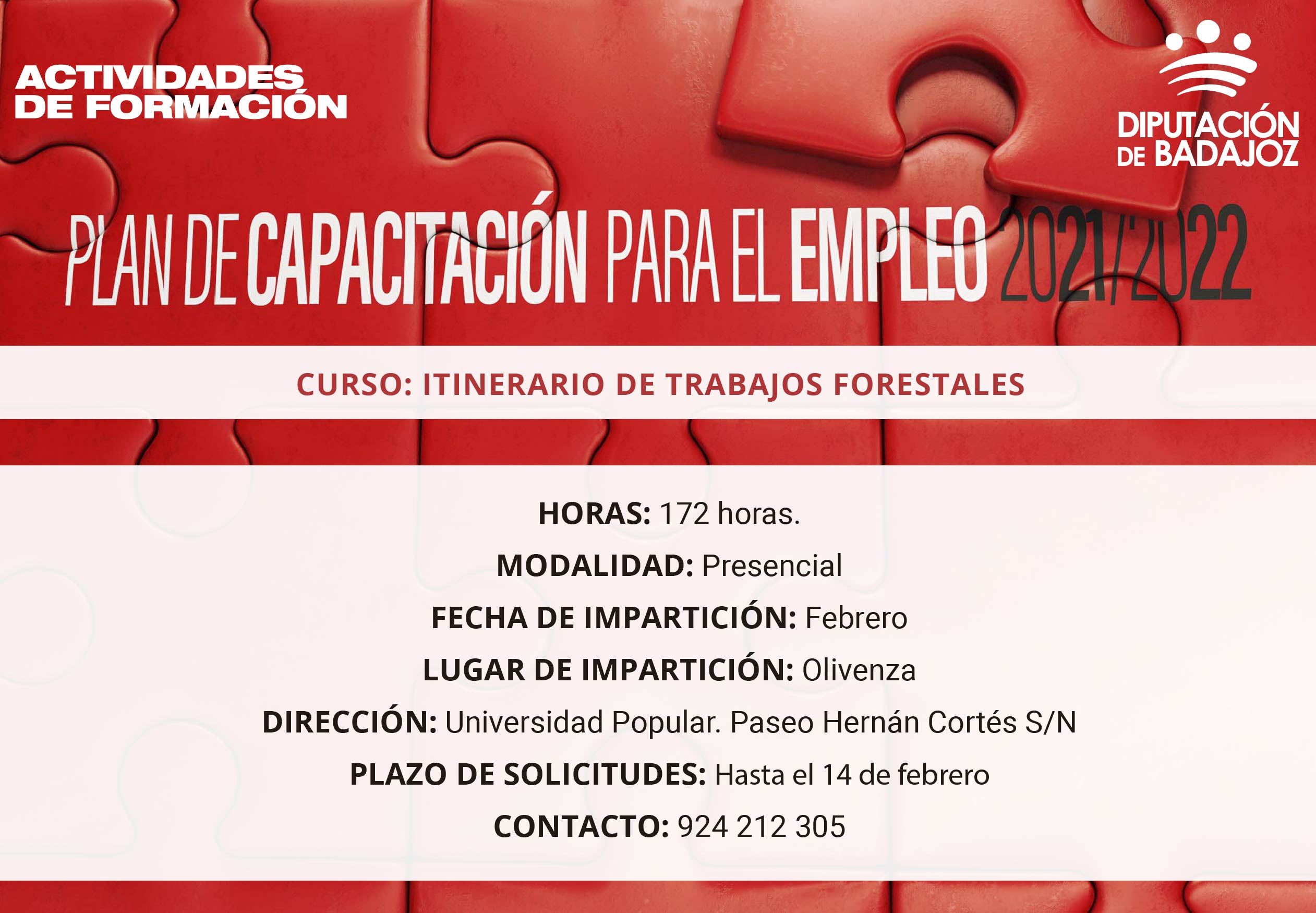 La Diputación de Badajoz, a través del Plan de Capacitación para el Empleo 21-22, desarrollado por el Servicio de Capacitación para el Empleo, dependiente del Área de Desarrollo Rural y Sostenibilidad, va a iniciar una acción formativa de ‘’Itinerarios de trabajos forestales’’ en la localidad de Olivenza, en las instalaciones de la Universidad Popular, Paseo de Hernán Cortés, s/n.