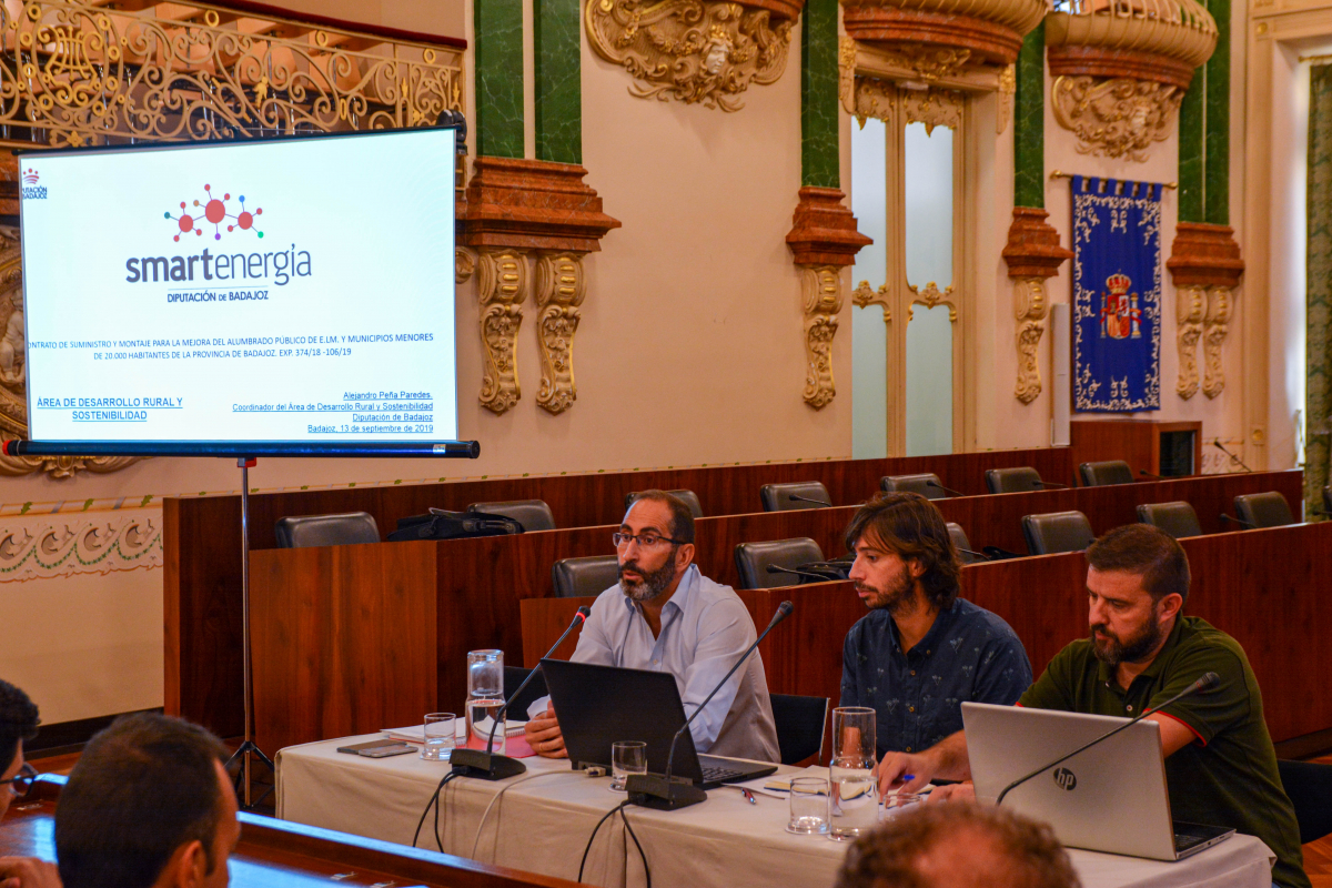 El Salón de Plenos de la Diputación de Badajoz ha sido testigo de la primera reunión de coordinación que ha llevado a cabo el Área de Desarrollo Rural y Sostenibilidad de la institución provincial con las empresas adjudicatarias de los expedientes 374/18 y 106/19 de licitación para el “Suministro y montaje para la mejora del alumbrado público de E.L.M. y municipios menores de 20.000 habitantes de la provincia de Badajoz”.