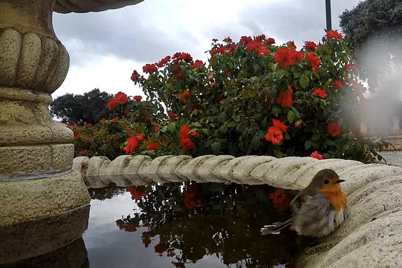 Erithacus rubecula; Hábitat: Jardín inmerso en una dehesa de encinas, alcornoques y pinos piñoneros (en menor cuantía estos últimos); Localidad: Badajoz (La Cocosa). Cuadrícula UTM: 29SPC79; Altitud: 245; Fecha: 05/11/2017