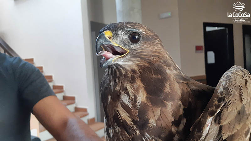 Buteo buteo (individuo accidentado); Hábitat: Dehesa de encinas, alcornoques y algunos pinos piñoneros dispersos; Localidad: Badajoz (La Cocosa). Cuadrícula UTM: 29SPC79; Altitud: 251; Fecha: 23/09/2019