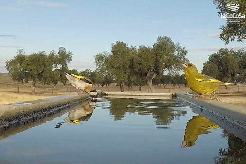Verderón (Chloris chloris) y Jilguero (Carduelis carduelis); Hábitat: Borde entre dehesa y área cerealista sin estrato arbóreo; Localidad: Badajoz (La Cocosa). Cuadrícula UTM: 29SPC79; Altitud: 251; Fecha: 26/06/2019