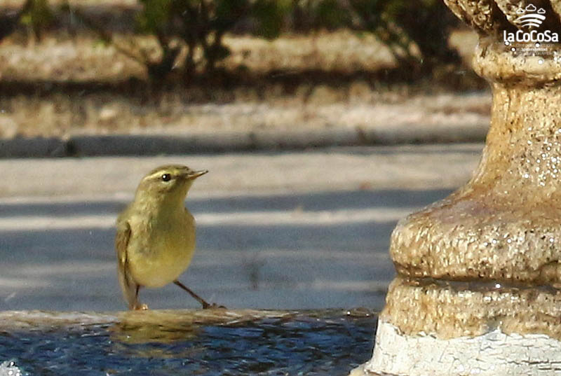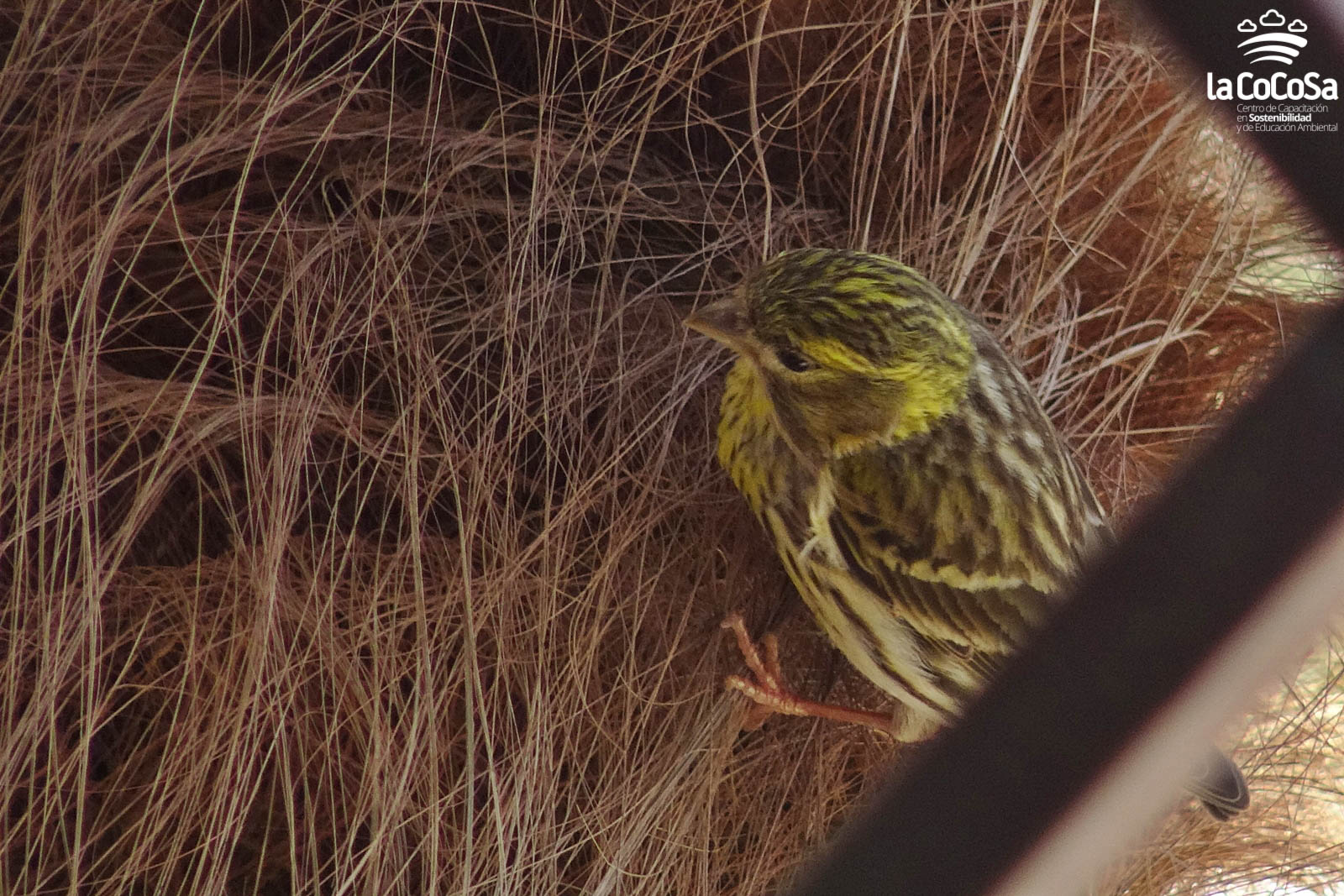 Verdecillo (Serinus serinus). El verdecillo es un pájaro (un passeriforme) pequeño, de no más de 11 gr de peso y 11,5 cm de longitud, con un canto distintivo de notas pequeñas, agudas y muy rápidas, que recuerda al chirriar de una ventana o al crepitar del aceite en una sartén, y también al canto de los canarios, ave con las que está muy emparentada, ya que pertenece al mismo género Serinus. Tiene unos colores amarillentos y verdosos con franjas verticales entrecortadas y difusas más oscuras, casi negras. (La Cocosa, entorno de los Chozos, 09/03/2020); en la imagen, Verdecillo recogiendo fibras de una palmera para tapizar el nido (La Cocosa, 17/04/2018)