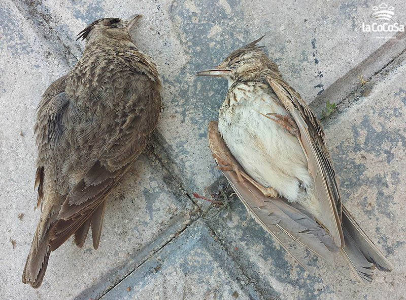 Galerida cristata (Encontradas muertas junto a un edificio en un día de mucho calor. Se aprecian en una de ella restos de hemorragia en una pata, síntoma quizás de algún golpe contra un cristal o algo similar); Hábitat: Dehesa de encinas y alcornoques (en mucho menor número) con áreas cerealistas; Localidad: Badajoz (La Cocosa). Cuadrícula UTM: 29SPC79; Altitud: 245; Fecha: 10/06/2017