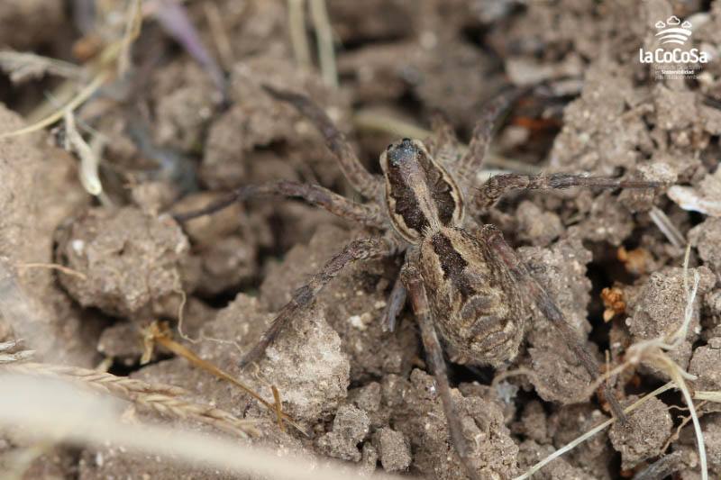 Lycosa sp.; Localidad: La Cocosa; Hábitat: Dehesa de encinas y alcornoques con algunos pinos piñoneros; Cuadrícula UTM: 29SPC79; Altitud: 237; Fecha: 08/05/2018