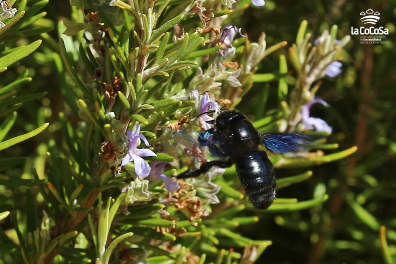 Xylocopa sp.; Localidad: La Cocosa; Hábitat: Dehesa de encinas y alcornoque y áreas cerealistas despobladas.. Fotografiada en jardín sobre romero; Cuadrícula UTM: 29SPC79; Altitud: 245; Fecha: 27/10/2017