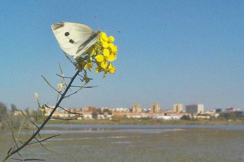 Pieris brassicae L.; Hábitat: Parque urbano; Localidad: Badajoz; Paraje: Guadiana a la altura de Puente Real; Cuadrícula UTM: 29SPD70; Altitud: 165; Fecha: 16/11/2018.