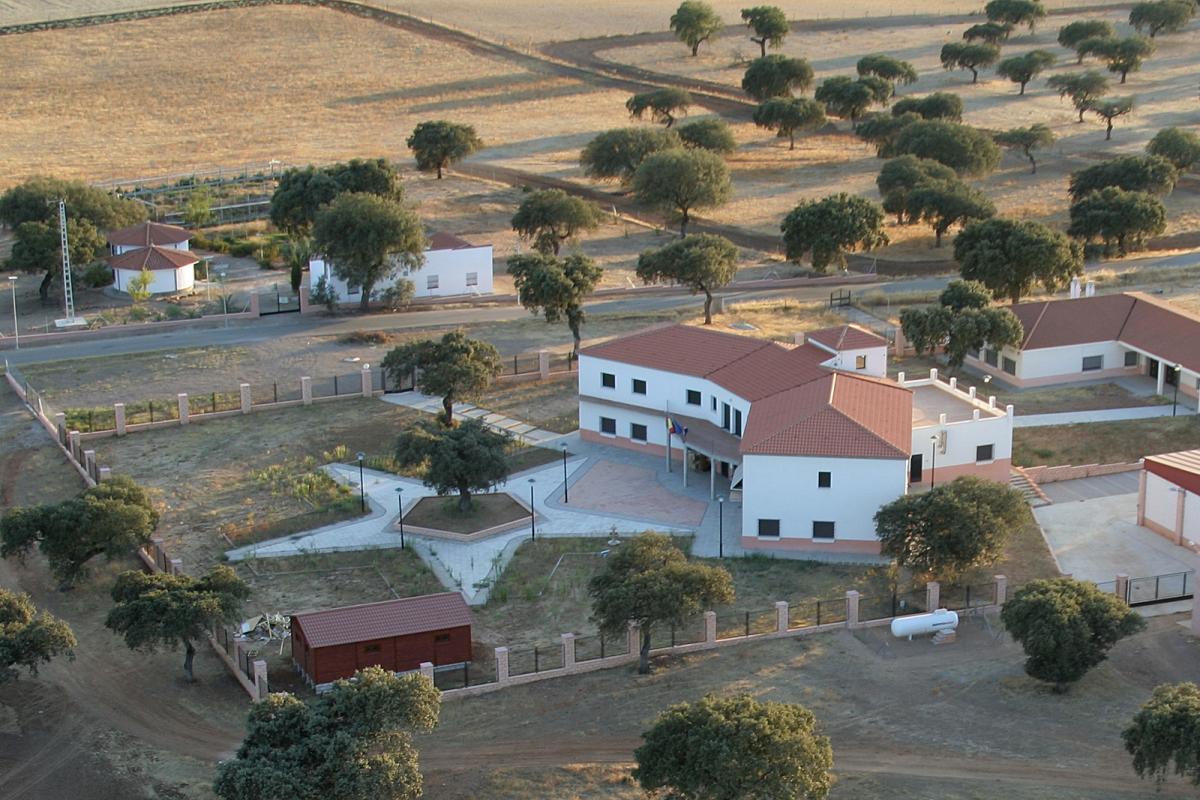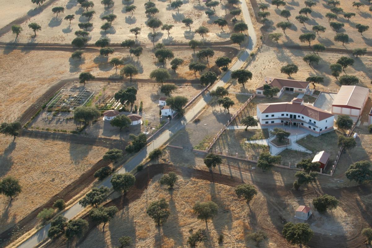 Los edificios de CSEA La Cocosa inmersos en la espectacular dehesa de encinas y alcornoques que pueblan la finca